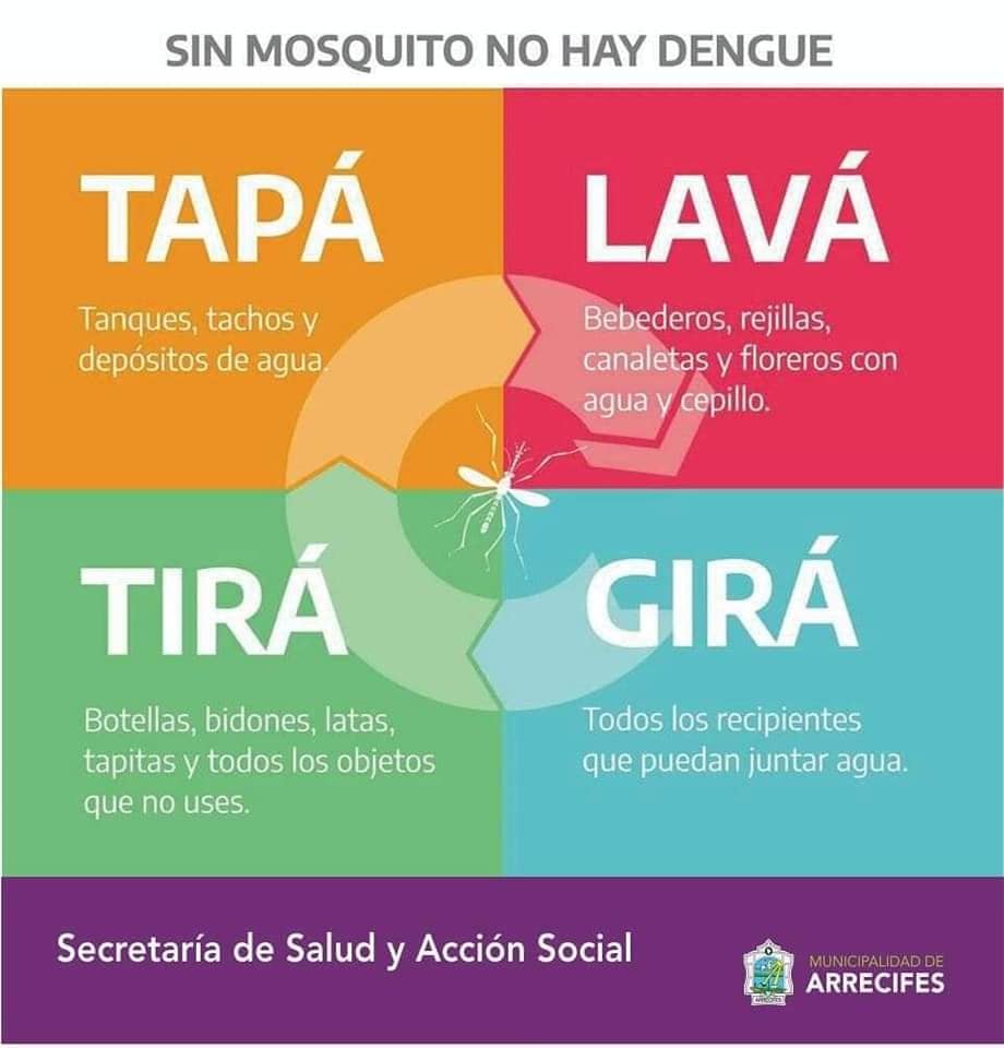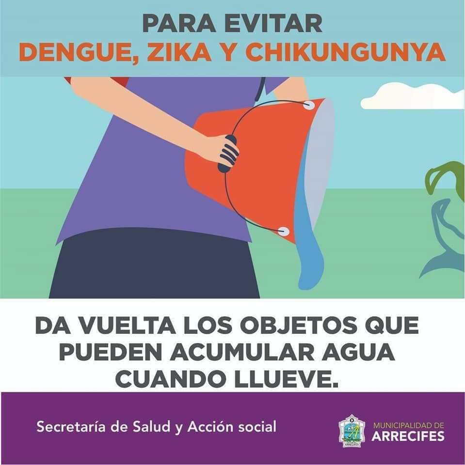 La Secretaría de Salud y Acción Social de la Municipalidad de Arrecifes, informa la importancia de implementar medidas de prevención del Dengue, solicitando a los vecinos mantener sus espacios libres de malezas, limpios y descacharrados, evitando así la acumulación de charcos de agua, y lugares que propicien su anidamiento y proliferación.